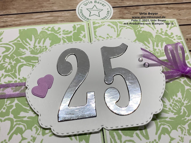Außen sticht auf den ersten Blick die silberne "25" hervor. Die zwei kleinen Herzen in Freesienlila stehen für die langjährige Liebe des Jubelpaares. Die Mattungen auf den Seiten sind mit dem schönen Hintergrund-Stempel Wild Roses verschönert. Verschlossen wird die Karte mit einer Schleife, das Band farblich passend zu den Herzen. Noch etwas Glitzer verteilen und fertig. 😊